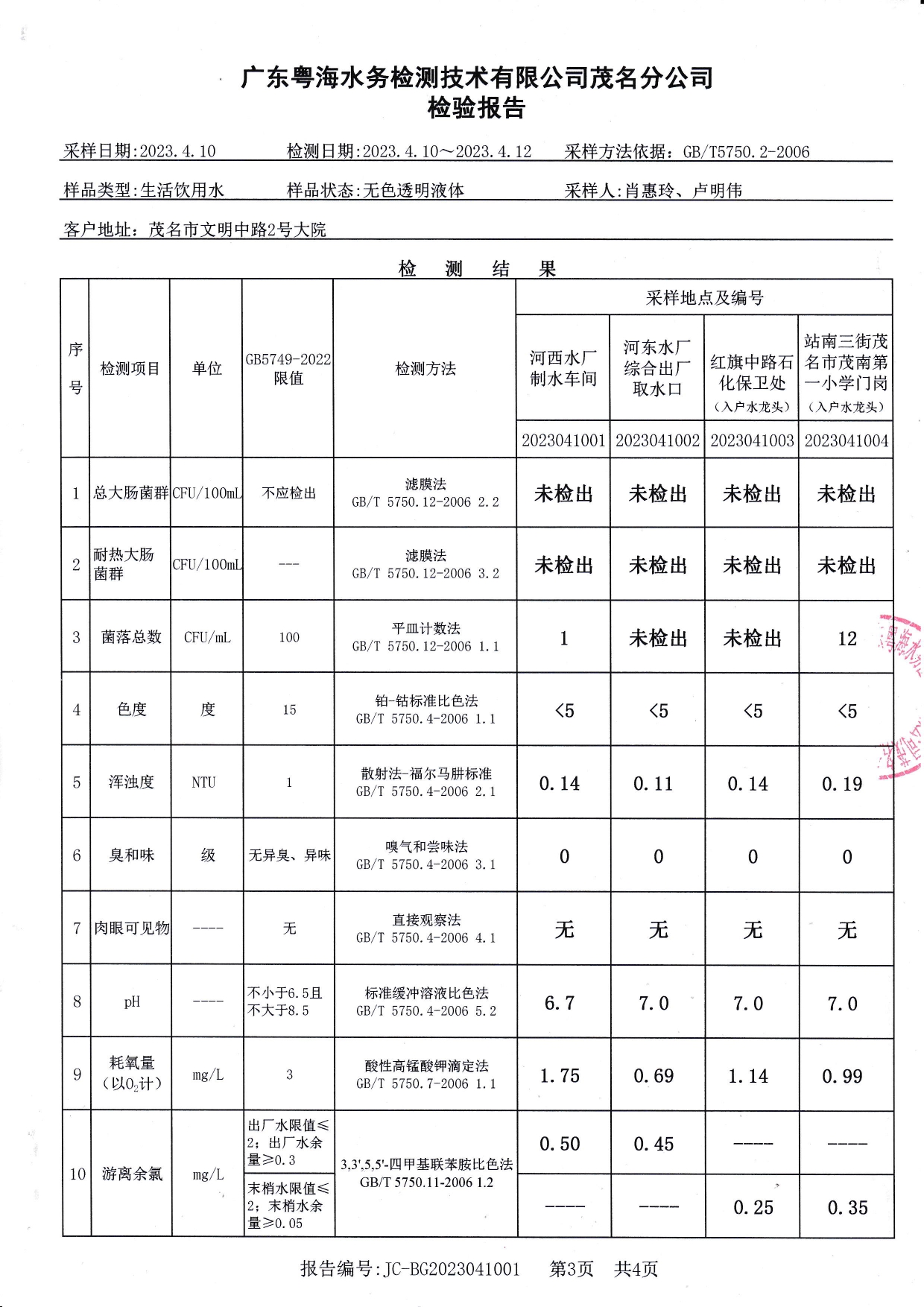 2023年4月10日市區(qū)水質(zhì)檢測(cè)報(bào)告